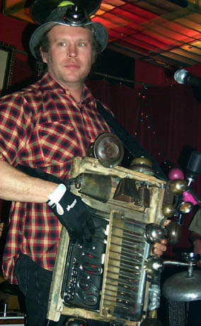 He’s probably Canada’s most identifiable washboard player. His tall frame holding up 45 pounds of musical junk attached to his washboard; his head crowned in with a metal helmet with a desk bell and a Volkswagen hubcap. He started as a member of The Lost Followers, toasting the bars of Peterborough, playing everything including the kitchen sink. His songs poke fun at such things as ‘The Donut Shops of Ontario’ to the ‘Marmora Pig’. Has played in Fred Eaglesmith’s Flying Squirrels, Hank and the Honkers and currently fronts The Country Squires.