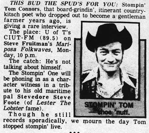 Like his pal Stevedore Steve, Stompin' Tom had been out of circulation on the Canadian music scene for about 12 years. I remember telling people that it was my intention to one day get an interview with Stompin' Tom Connors - who was on everybody's wish list at the time - and eyes would roll in heads as if I was a foolish little dreamer with my head in the sky.